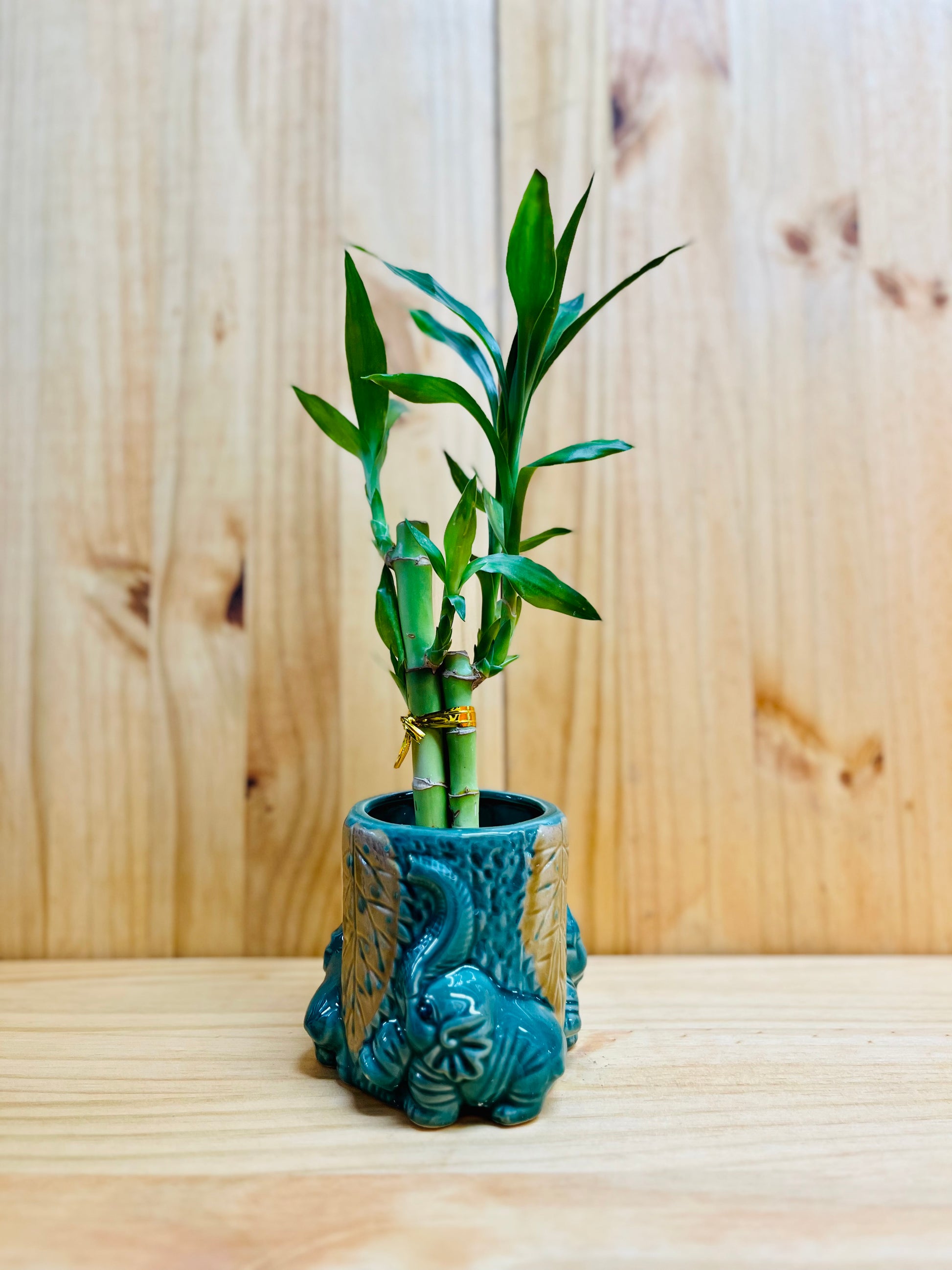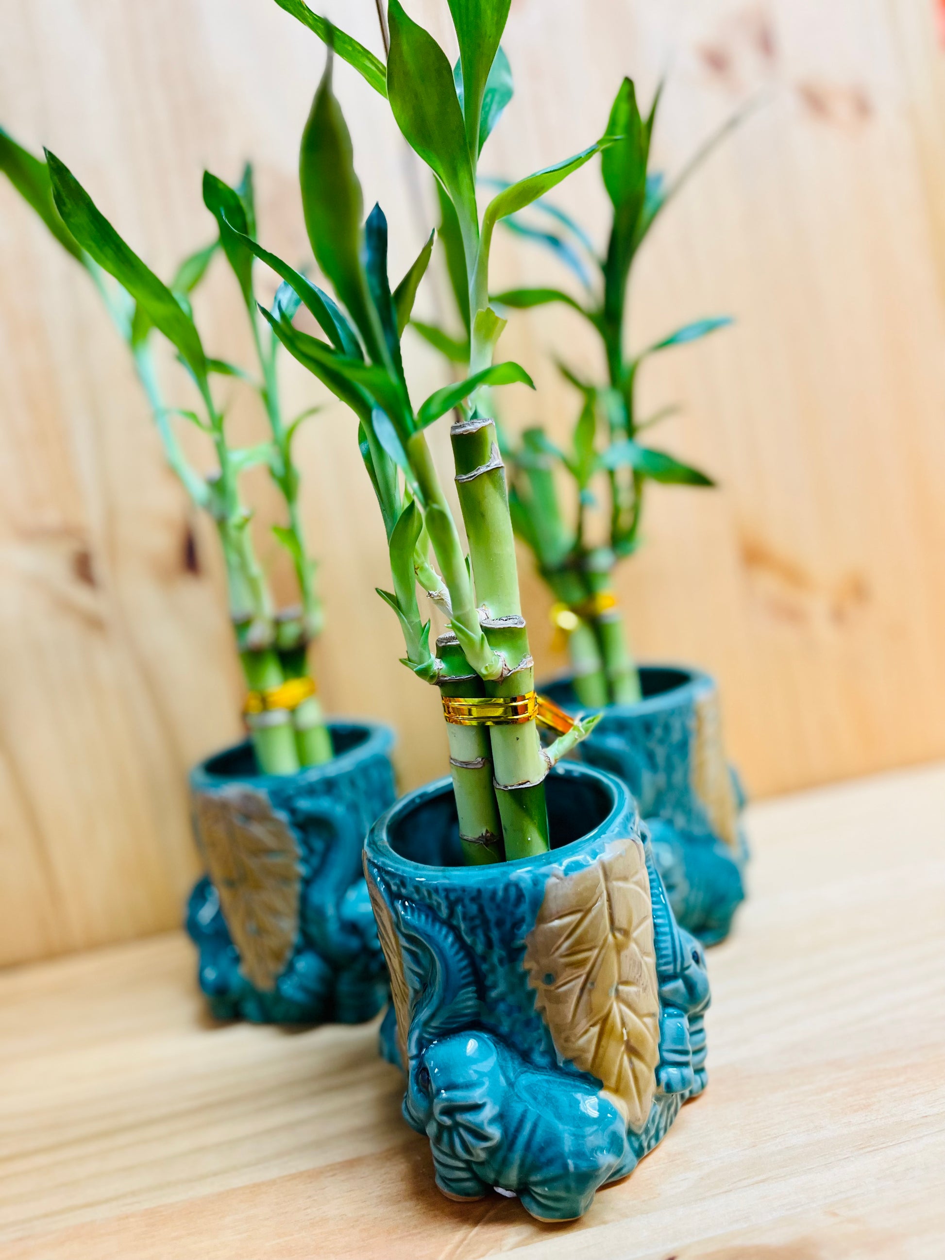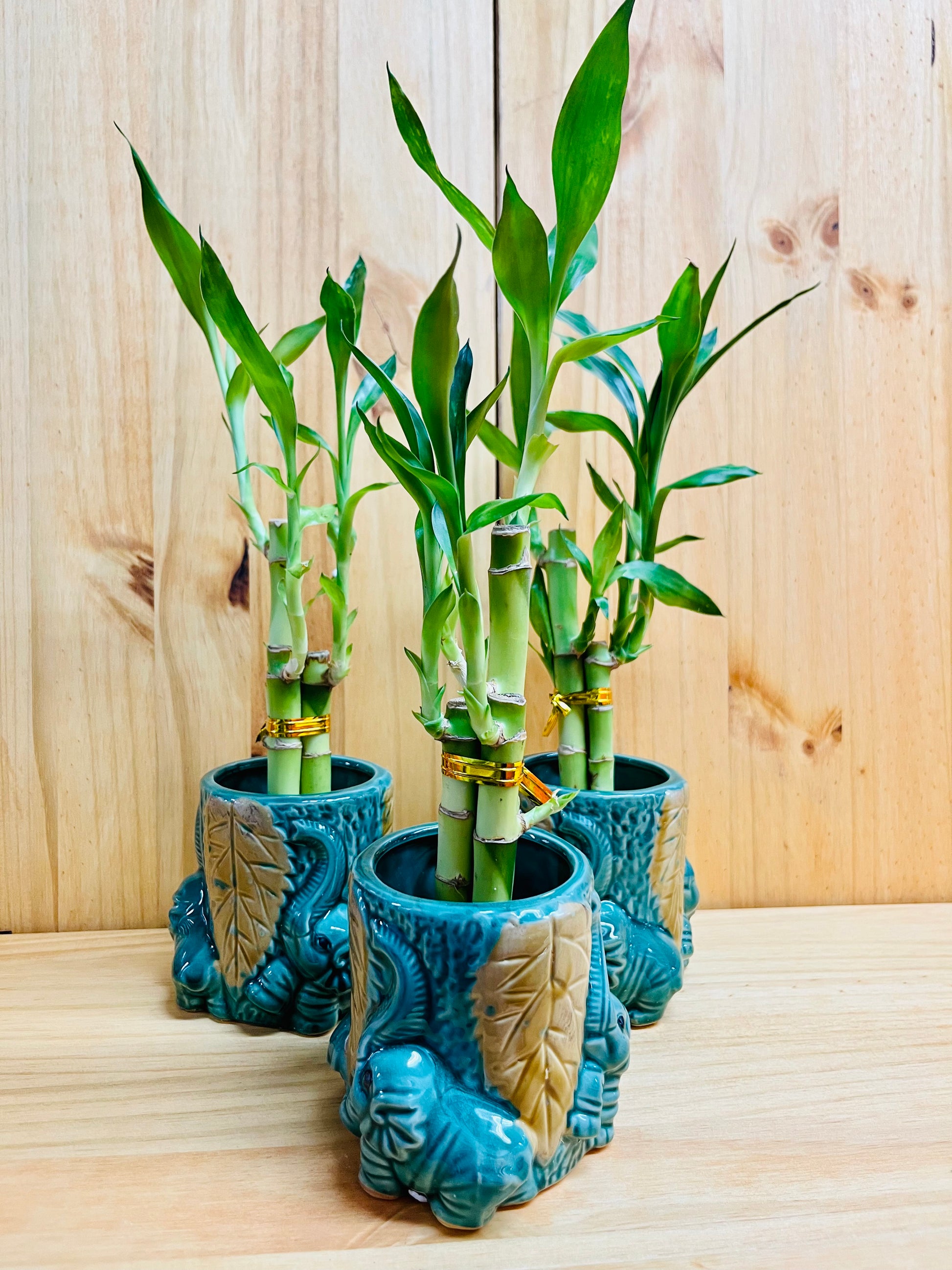 Bambú de la suerte en jarrón redondo de elefante de cerámica 3 tallos 6”6”8” Bambú